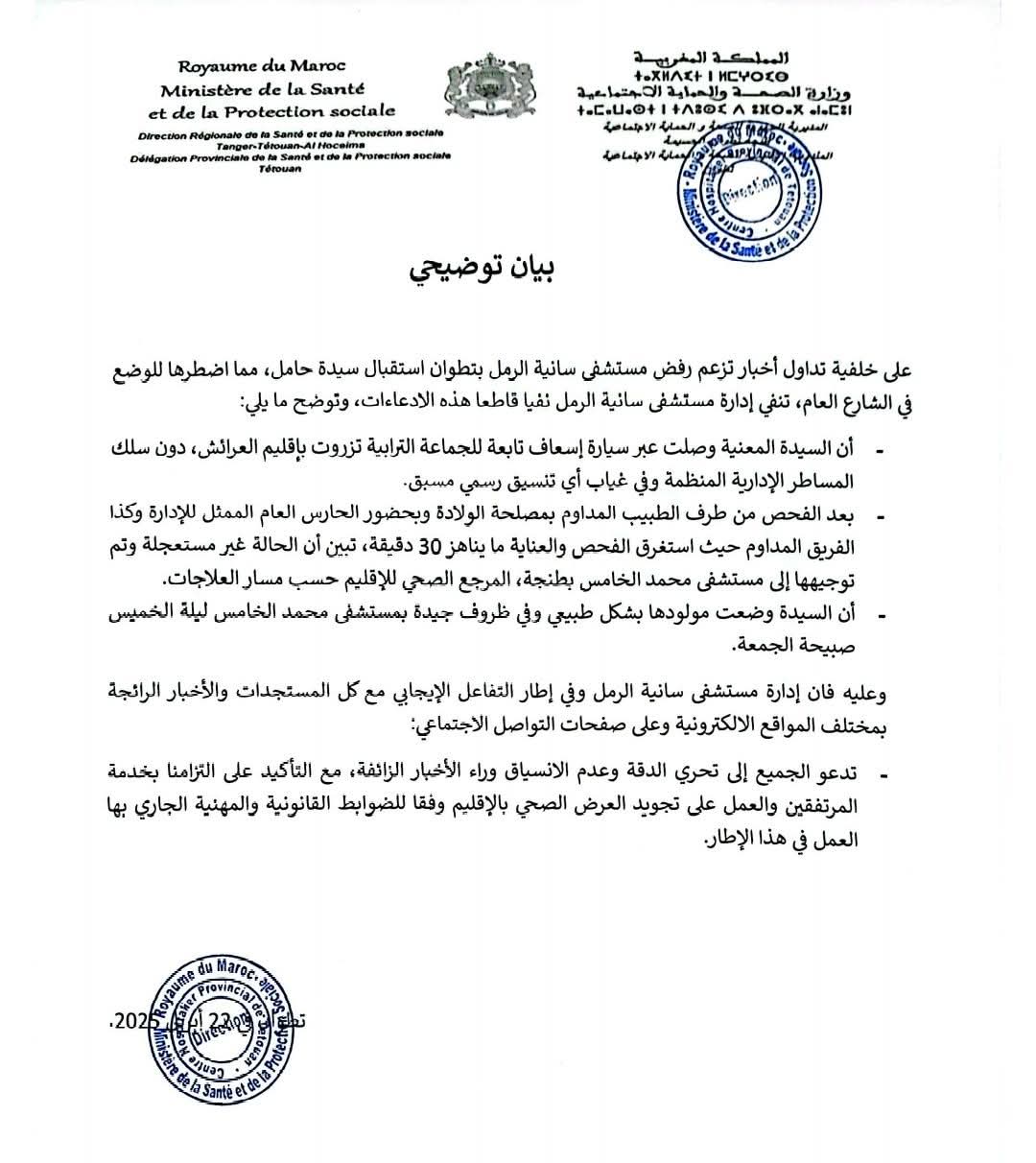 خرجت إدارة مستشفى سانية الرمل بتطوان ببيان توضيحي لتكذيب الأخبار التي تم تداولها على نطاق واسع بمواقع التواصل الاجتماعي، والتي تدّعي رفض المستشفى استقبال سيدة حامل، ما اضطرها للوضع في الشارع العام.