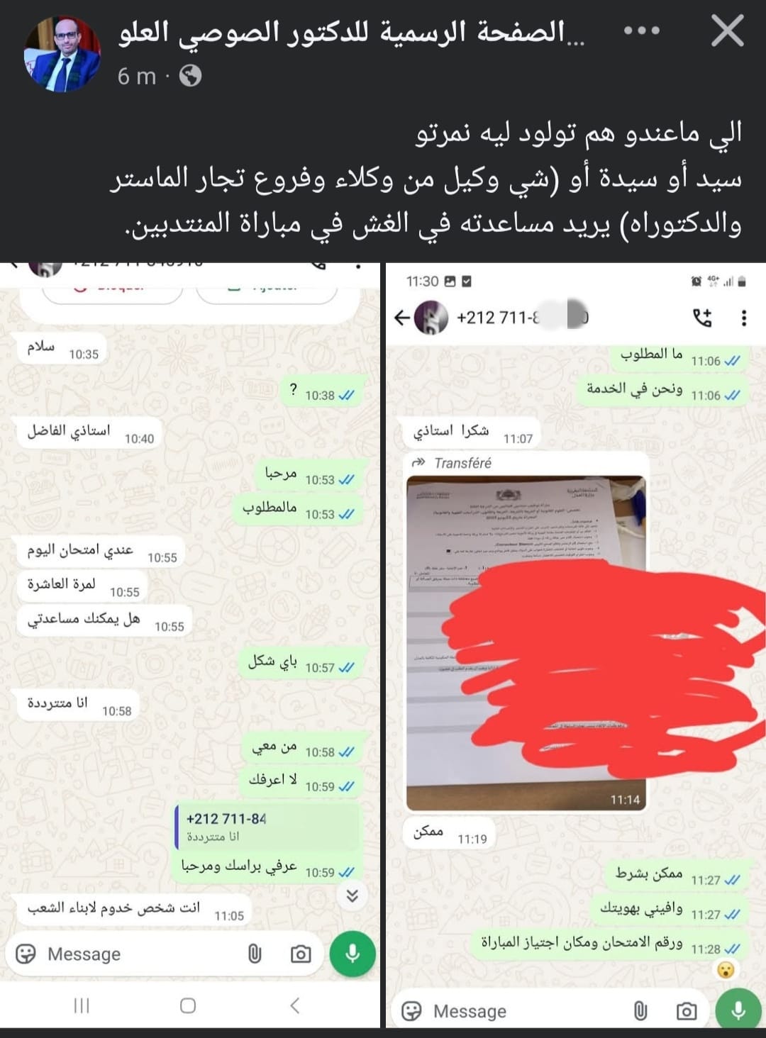 أثارت واقعة جديدة تتعلق بمباراة توظيف المنتدبين القضائيين من الدرجة الثالثة جدلا واسعا، بعدما كشف الأستاذ الجامعي عبد الكبير الصوصي العلوي عن محاولة إحدى المترشحات التواصل معه بغرض مساعدتها على الغش خلال اجتياز الامتحان، حيث نشر الصوصي العلوي، وهو إطار سابق مكلف بمنازعات الدولة، تدوينة عبر صفحته الرسمية بموقع فيسبوك أرفقها بصور لمحادثة جرت بينه وبين المترشحة المعنية.