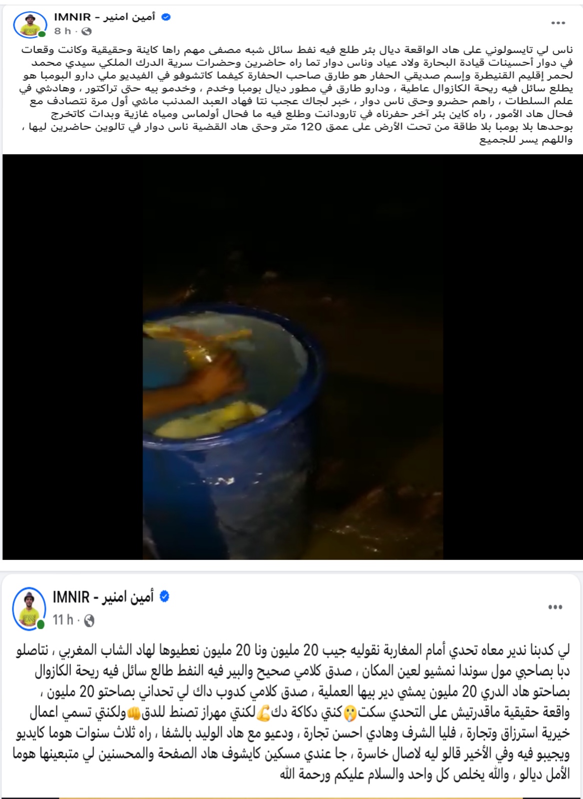 ولتعزيز روايته، نشر "فيسبوكي حر" مقطع فيديو يوثق، حسب زعمه، لحظة استخراج هذه المادة، مشيرا إلى أنه جرى استعمالها في تشغيل معدات ميكانيكية، مؤكداً أن الواقعة تمت بحضور عدد من سكان الدوار، إضافة إلى عناصر الدرك الملكي التي حلت بعين المكان لمعاينة الوضع وفتح تحقيق في الموضوع.