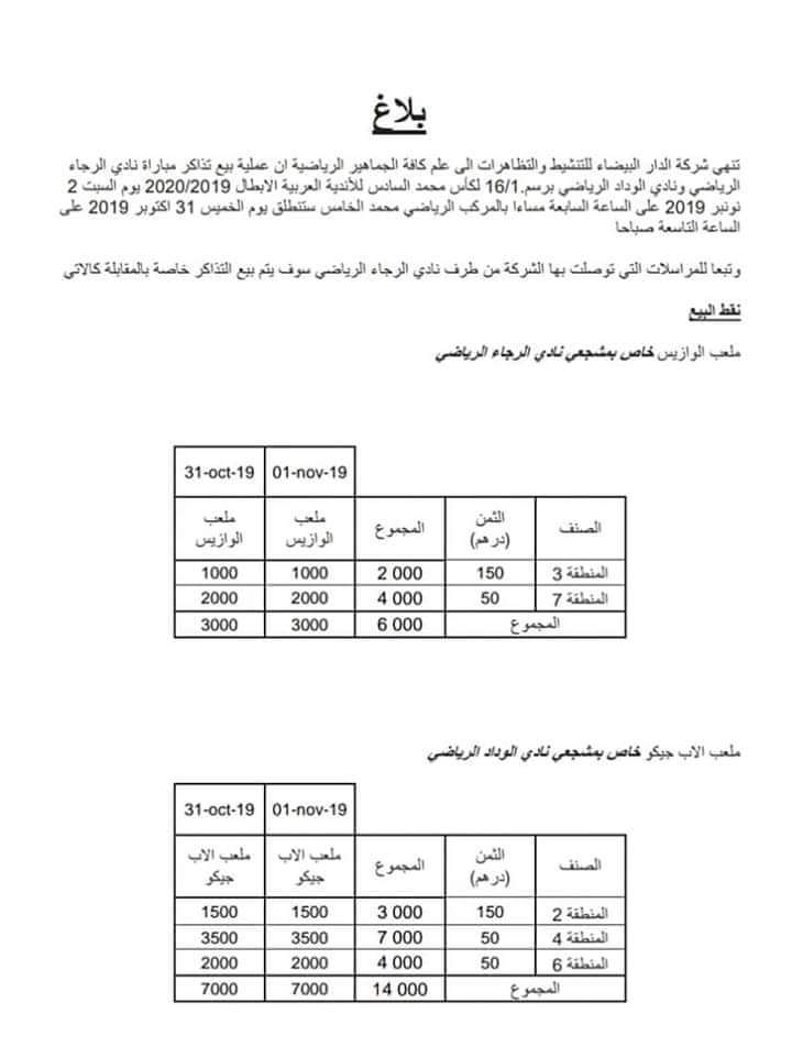 ووفق بلاغ للشركة المذكورة، فقد تم تخصيص 6.000 تذكرة لفائدة مشجعي الرجاء وسيتم بيعها يومي الخميس والجمعة فاتح نونبر بملعب الوازيس.