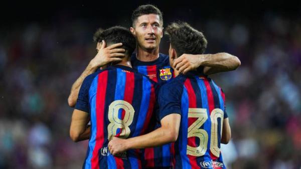 توج نادي برشلونة لكرة القدم، اليوم الأحد، بلقب كأس خوان جامبر ،وذلك عقب فوزه على ضيفه بوماس المكسيكي بسداسية نظيفة، في المباراة الودية السنوية التي يقيمها تكريما لمؤسس النادي. وسجل أهداف اللقاء كل من روبرت ليفاندوفسكي (د 3)، بيدري (د 5 ود 19)، عثمان ديمبيلي (د 10)، أوباميانغ (د 29)، وفرينكي دي يونغ (د 83).