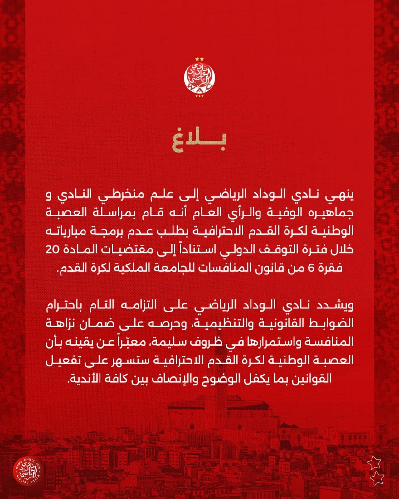 أعلن نادي الوداد الرياضي عن مراسلته الرسمية للعصبة الوطنية لكرة القدم الاحترافية، مطالباً بعدم برمجة مبارياته خلال فترات التوقف الدولي.