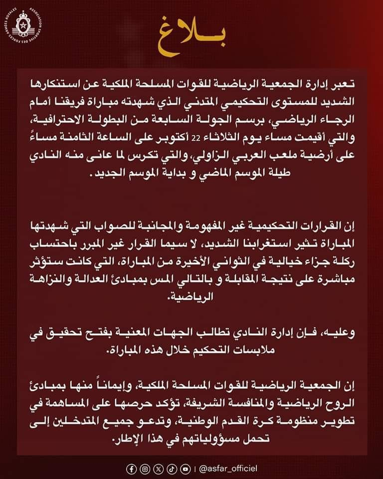 في ذات السياق، طالبت إدارة "العساكر" الجهات المعنية بـ"فتح تحقيق في ملابسات التحكيم خلال هذه المباراة"، حيث قالت في هذا الصدد: "إن الجمعية الرياضية للقوات المسلحة الملكية، وإيماناً منها بمبادئ الروح الرياضية والمنافسة الشريفة، تؤكد حرصها على المساهمة في تطوير منظومة كرة القدم الوطنية، وتدعو جميع المتدخلين إلى تحمل مسؤولياتهم في هذا الإطار".