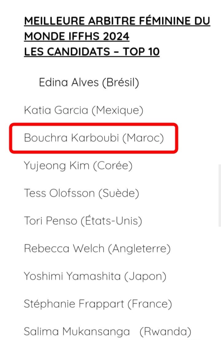 كشف الاتحاد الدولي للتأريخ والإحصاء (IFFHS)، أمس الخميس، عن أسماء المرشحات لنيل جائزة أفضل حكمة في عام 2024، وهي القائمة التي ضمت المغربية "بشرى كربوبي".