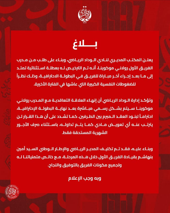 أعلن نادي الوداد الرياضي، اليوم الثلاثاء، عن منح مدرب الفريق الأول رولاني موكوينا إجازة استثنائية تمتد إلى ما بعد خوض الفريق لمباراته الأخيرة في البطولة الاحترافية، وذلك استجابة لطلب تقدم به المدرب، بسبب ما وصفته إدارة النادي بـ"الضغوطات النفسية الكبيرة" التي عاشها في الفترة الأخيرة.