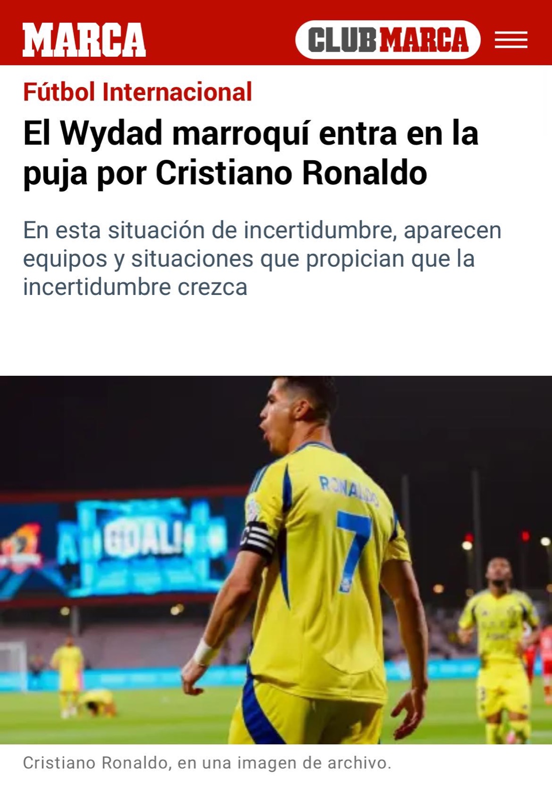 صحيفة "ماركا" الإسبانية، وفي تقرير للصحفي خوسيه فيليكس دياز، كشفت أن الفريق المغربي دخل رسميًا على خط الأندية المهتمة بخدمات "الدون"، من أجل ضمه خلال نافذة يونيو المقبلة، وتعزيز صفوفه في المونديال. ووفق ذات المصدر، فإن إدارة الوداد ترى في انضمام كريستيانو فرصة استثنائية من الناحيتين الرياضية والتسويقية، لما يمكن أن يمثله النجم البرتغالي من إضافة قوية داخل وخارج الملعب.
