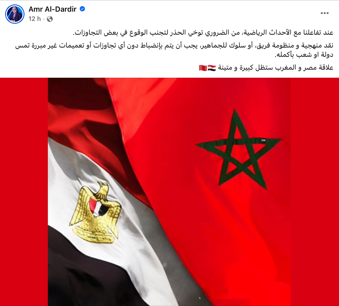 في خضم الحملة المسعورة التي تشنها صفحات ومواقع مصرية على المغرب بسبب أحداث الشغب التي عرفتها مباراة الجيش الملكي والأهلي المصري، بادر الإعلامي والناقد الرياضي المصري "عمر الدردير" إلى نشر تدوينة عبر صفحته الرسمية على فيسبوك دعا فيها إلى ضبط النفس وتوخي الحذر عند التعامل مع الأحداث الرياضية، مؤكداً أن النقد الموجه لمنهجية الفرق أو سلوك الجماهير يجب أن يتم بطريقة منضبطة، دون تعميمات غير مبررة تمس دولة أو شعباً بأكمله. وأوضح "الدردير" أن علاقة مصر والمغرب ستظل كبيرة ومتماسكة، في إشارة واضحة إلى ضرورة الفصل بين تجاوزات فردية وعلاقات الأخوة التي تجمع الشعبين الشقيقين.