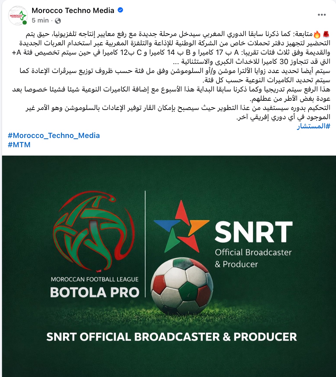 وارتباطا بالموضوع، أوضحت صفحة "Morocco Techno Media" الفيسبوكية المتخصصة في الإعلام الرياضي والتكنولوجي، أن الشركة الوطنية للإذاعة والتلفزة المغربية تستعد لتجهيز دفتر تحملات جديد ينظم تجهيز مباريات البطولة باستخدام عربات بث مختلفة ضمن ثلاث فئات رئيسية: فئة A بـ17 كاميرا، فئة B بـ14 كاميرا، وفئة C بـ12 كاميرا، في حين سيتم تخصيص فئة A+ للمناسبات الكبرى والاستثنائية، والتي قد تتجاوز عدد كاميراتها 30 كاميرا.