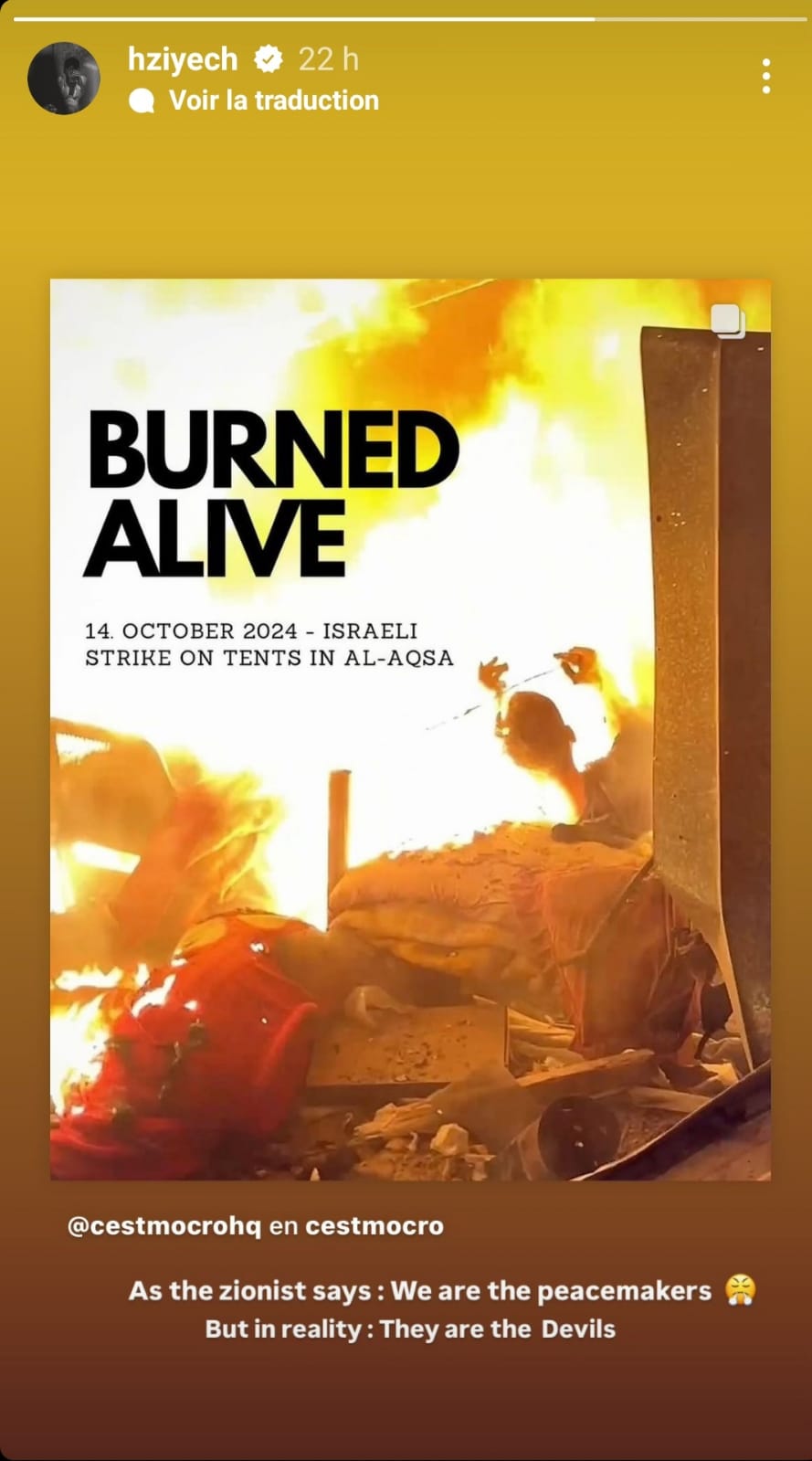 ونشر زياش تدوينة في خاصية "الستوري" قال فيها: "في الوقت الذي يدّعون فيه أنهم دعاة سلام، هم في الواقع شياطين"، مرفقًا كلماته بصورة صادمة تُظهر جنود الاحتلال الإسرائيلي وهم يحرقون نازحين فلسطينيين في مستشفى شهداء الأقصى بمدينة دير البلح بقطاع غزة، وفق ما أشار إليه المنشور.