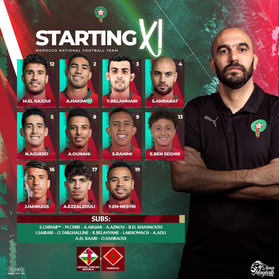 لم يُجرِ الناخب الوطني وليد الركراكي تغييرات كبيرة على تشكيلة المنتخب التي لعبت المباراة الأولى أمام إفريقيا الوسطى، حيث استبدل فقط أيوب الكعبي بيوسف النصيري.