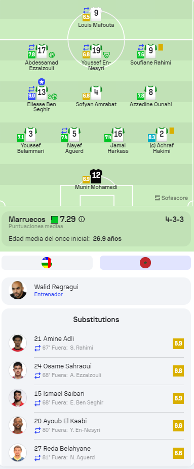 منح موقع "Sofascore"، إلياس بنصغير، أفضل تنقيط ضمن لاعبي المنتخب الوطني، في المباراة التي فاز بها أمام إفريقيا الوسطى برباعية نظيفة، اليوم الثلاثاء بالملعب الشرفي بوجدة، برسم الجولة الرابعة من المجموعة الثانية، في إطار تصفيات كأس أمم إفريقيا المقررة بالمغرب.