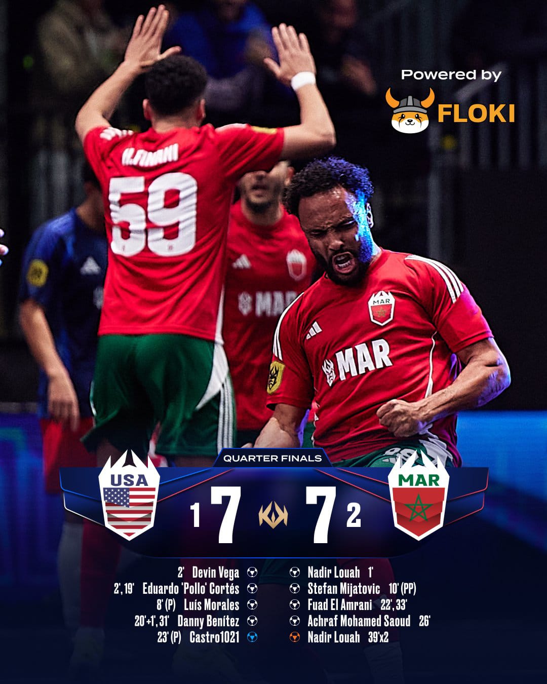 حقق المنتخب المغربي إنجازًا تاريخيًا بتأهله إلى نصف نهائي مونديال "دوري الملوك" بعد فوزه على نظيره الأمريكي في ربع النهائي بركلات الترجيح بنتيجة 2-1، عقب انتهاء المباراة بالتعادل 7-7.