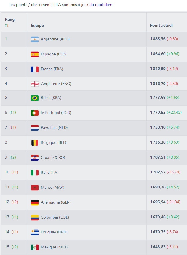 وجاء هذا التقدم اللافت لأسود الأطلس عقب تحقيقهم لانتصارين وديين على كل من تونس (2-0) والبنين (1-0)، مما منحهم 4.52 نقاط إضافية رفعت رصيدهم إلى 1698.76 نقطة، في المقابل فقد منتخب ألمانيا 21.04 نقطة إثر خسارته أمام كل من البرتغال وفرنسا في دوري الأمم الأوروبية.