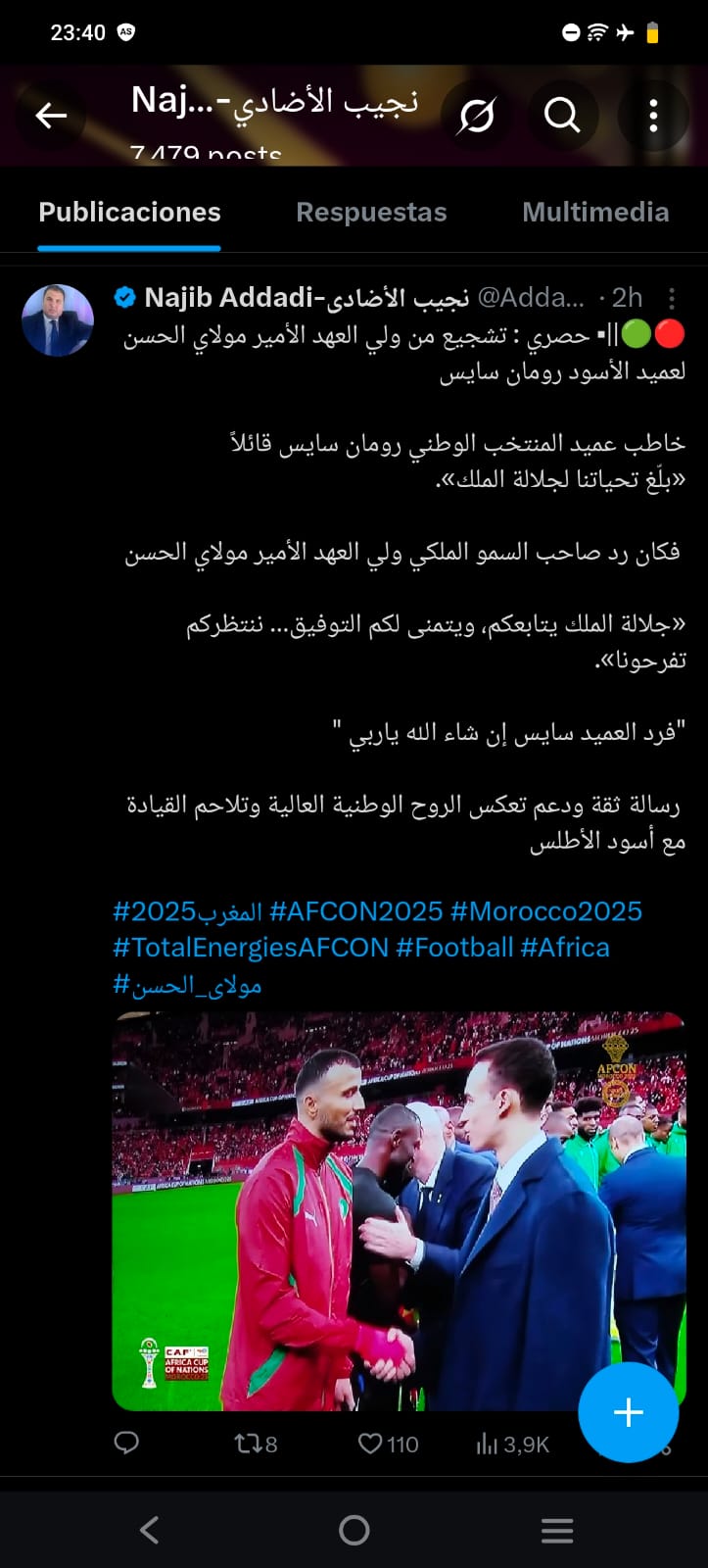 وأفاد المؤثر نجيب الأضادي عبر حسابه على الفايسبوك بأن ولي العهد وجه رسالة تشجيع خاصة لعميد المنتخب الوطني، رومان سايس، الذي خاطب سموه قائلاً: “بلغ تحياتنا لجلالة الملك”، فأجابه الأمير مولاي الحسن: “جلالة الملك يتابعكم، ويتمنى لكم التوفيق… ننتظركم تفرحونا”، ليختتم العميد رده بـ: “إن شاء الله يا ربي”، في تعبير صادق عن المسؤولية والعزم أمام التحديات.