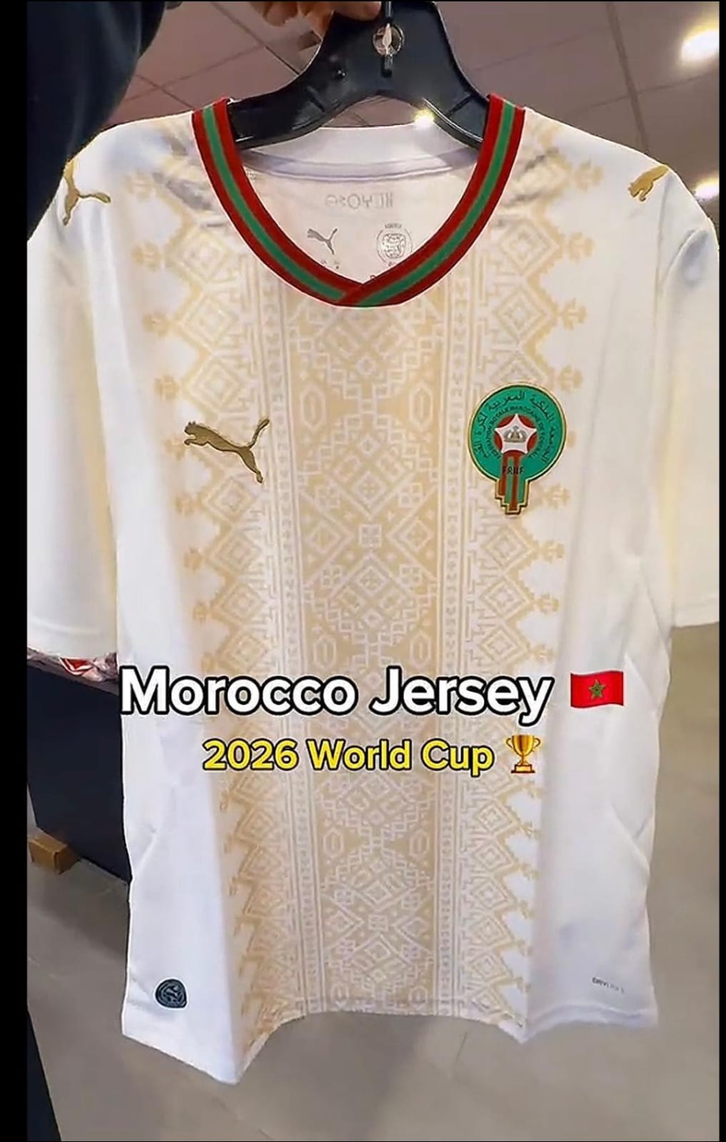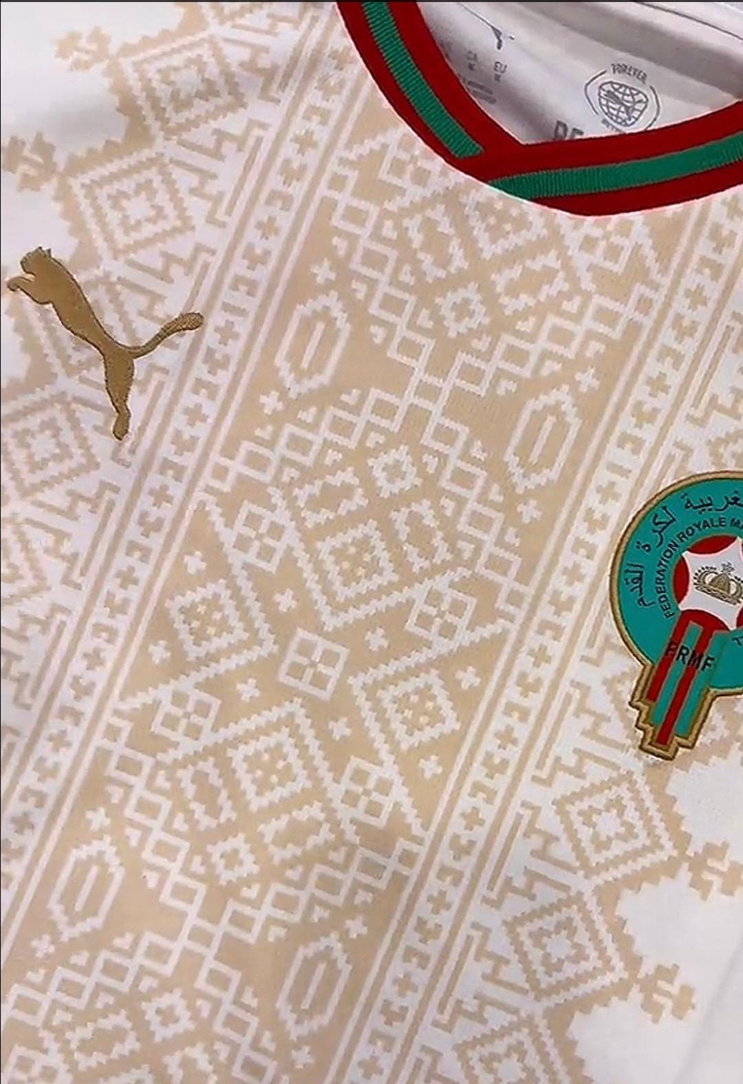 وتظهر الصور والفديوهات المتداولة قميصا أبيض اللون يتوسطه شريط عمودي مزين بنقوش مستوحاة من فن “الزليج” المغربي بلون ذهبي، مع ياقة دائرية تحمل ألوان العلم الوطني الأحمر والأخضر؛ حيث يرى متابعون أن التصميم المفترض يجمع بين الطابع العصري وبعض العناصر المرتبطة بالهوية البصرية المغربية، وهو توجه ظهر في بعض الأطقم السابقة للمنتخب.
