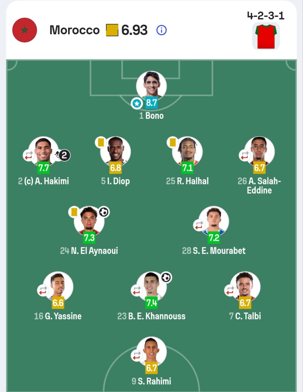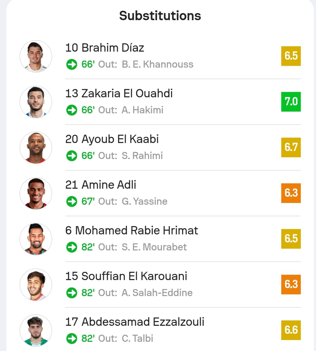 وأظهرت المباراة أيضاً قيمة دكة البدلاء المغربية، حيث قدم زكرياء الواحدي أداءً صلباً فور دخوله بدلاً من حكيمي محصلاً على تنقيط (7.0)، عكس أيوب الكعبي وإبراهيم دياز وأمين عدلي وعبد الصمد الزلزولي الذين لم يتمكنوا من الحفاظ على نفس النسق الهجومي بعد دخولهم في الثلث الأخير من المباراة.
