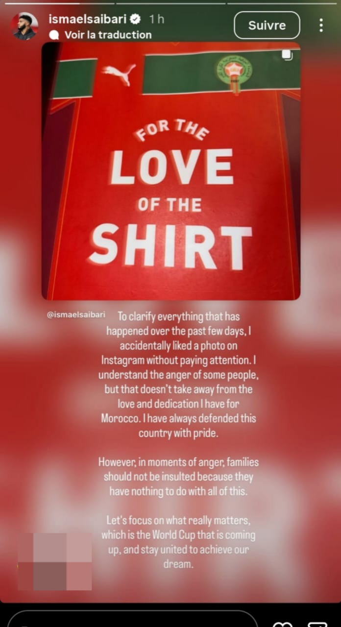 وعبر خاصية "الستوري" على حسابه الرسمي في "إنستغرام"، نشر صيباري توضيحاً باللغة الإنجليزية مرفقاً بشعار المنتخب الوطني، جاء فيه: "لتوضيح كل ما حدث خلال الأيام القليلة الماضية، لقد قمت بالإعجاب بصورة على إنستغرام عن طريق الخطأ ودون انتباه. أتفهم غضب البعض، لكن ذلك لا ينقص من الحب والتفاني الذي أكنه للمغرب، لقد دافعت دائماً عن هذا البلد بكل فخر".