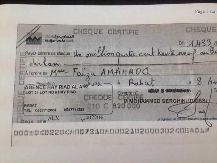 و بلغت القيمة المالية للشيك، مليون وأربع مائة وتسعة وثلاثين درهما، مما أثار جدلا واسعا حول طبيعة هذه الصفقة ، سيما أن زوجة الوزير السابق تشتغل كمديرة مركزية في قطاع التكوين المهني.