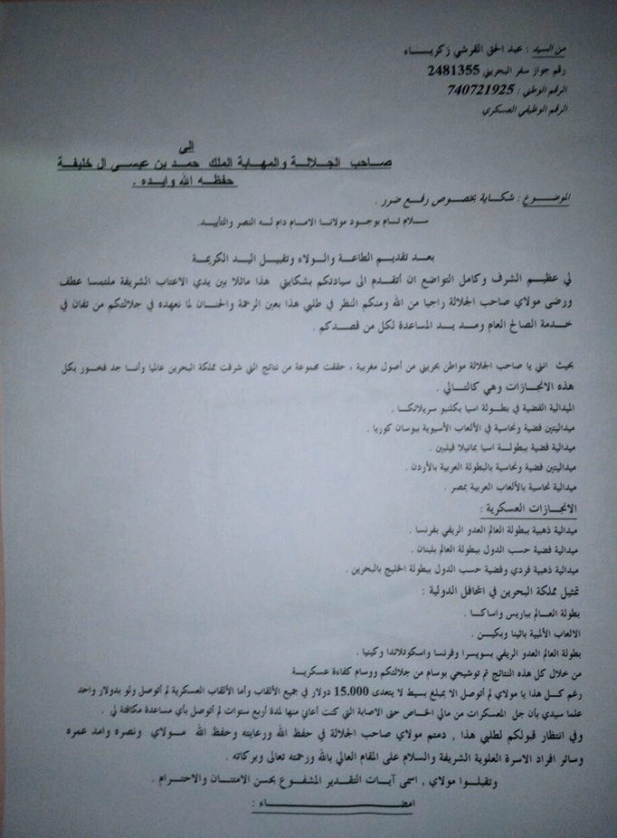 بعد أزيد من 15 سنة من التضحية و العطاءات والإنجازات التي حققاها بألوان المنتخب البحريني لألعاب القوى ، وجه العداءان البحرينيان من أصول مغربية، عبد الحق الكرش ( عبد الحق القرشي زكريا ) و مصطفى رياض ، نداء استغاثة و استعطاف إلى ملك البحرين الذي حل أمس الخميس بالمغرب، في زيارة خاصة، من أجل التدخل قصد إنصافهما من الشطط الجائر الذي لحق بهما معا، بعد ان منعا من المشاركة في أي مسابقة ، وجردا من راتبهما الشهري و جواز السفر .