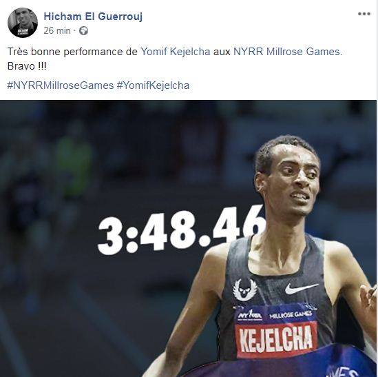 وعلق صاحب الرقم القياسي عبر تدوينة على حسابه الرسمي بالفايسبوك، قائلا "انجاز جد رائع من يوميف كيجيلشا في NYRR Millrose Games .. برافو!!!".