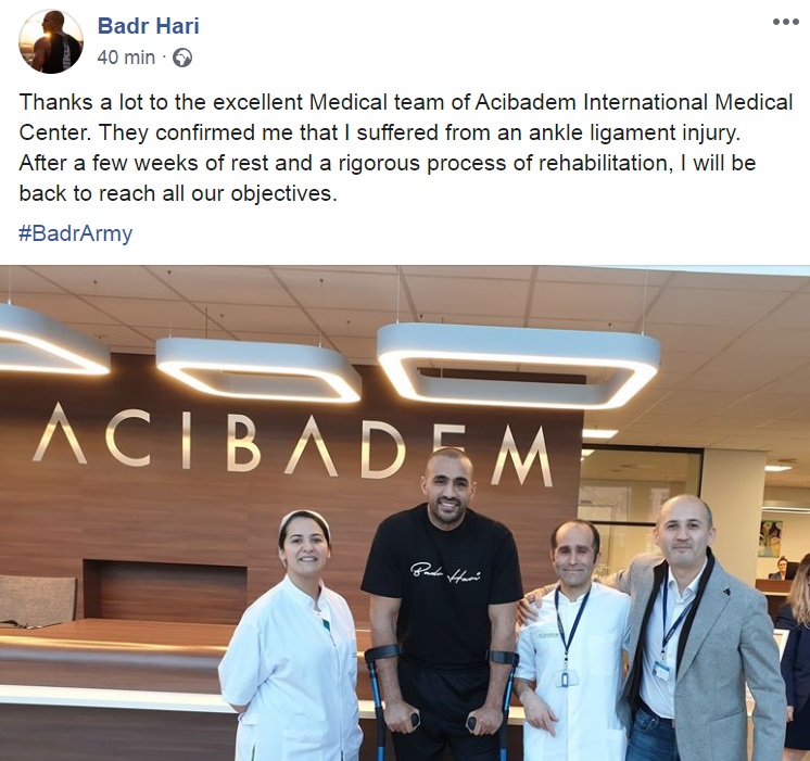 وأوضح "بدر هاري" في ختام التدوينة أنه سيعود إلى التباري بعد أسابيع قليلة من العلاج والترويض.