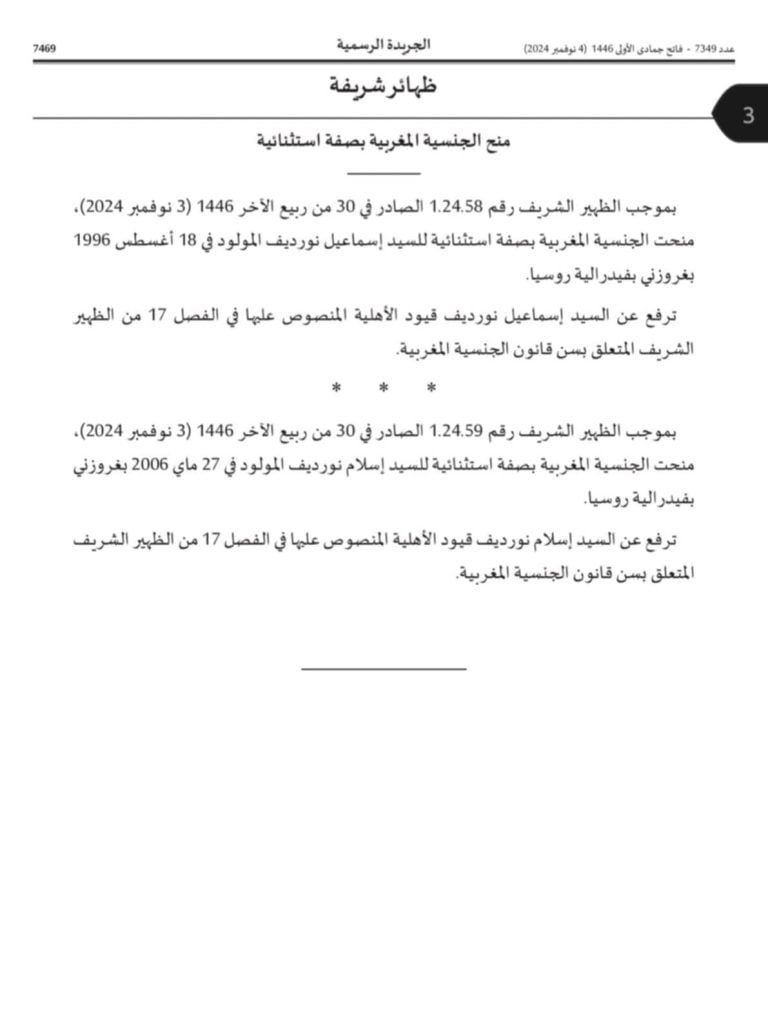 في خطوة تعزز المشهد الرياضي الوطني، منح الملك محمد السادس الجنسية المغربية للمقاتلين العالميين في رياضة الفنون القتالية المختلطة (UFC)، الشقيقين إسماعيل وإسلام نوردييف، اللذان ينحدران من الشيشان.