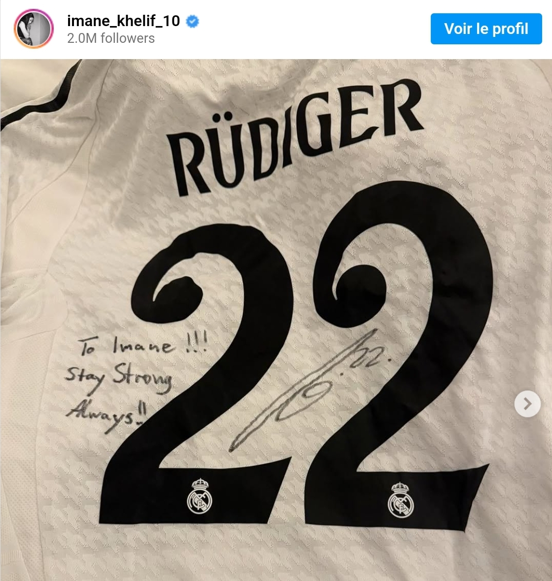 في تطور غير متوقع، حصلت الملاكمة الجزائرية إيمان خليف على دعم قوي من نجم ريال مدريد، الألماني أنطونيو روديغير، الذي أهدى لها قميصه موقّعًا برسالة مؤثرة كتب فيها: "إلى إيمان، ابقِ قوية دائمًا". اللاعبة الأولمبية لم تتردد في مشاركة هذه اللفتة عبر حسابها على إنستغرام، حيث نشرت صورة القميص الذي يحمل الرقم 22، مع توقيع روديغير وكلماته الداعمة التي أثارت تفاعلًا واسعًا بين متابعيها.