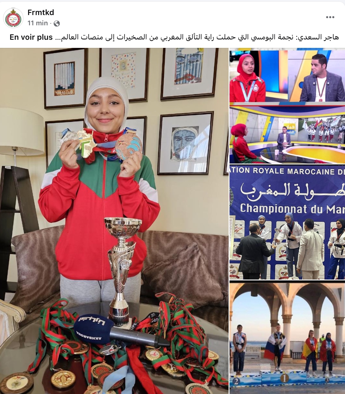 في إطار مساعيها الرامية إلى تشجيع ودعم المواهب الشابة التي سجلت حضورًا مميزًا على الصعيدين القاري والدولي، خصّت الجامعة الملكية المغربية للتايكواندو البطلة "هاجر السعدي"، المتحدرة من مدينة الصخيرات والبالغة من العمر 20 سنة فقط، باعتراف رمزي عبر رسالة نشرتها على صفحتها الرسمية في منصة "فيسبوك".