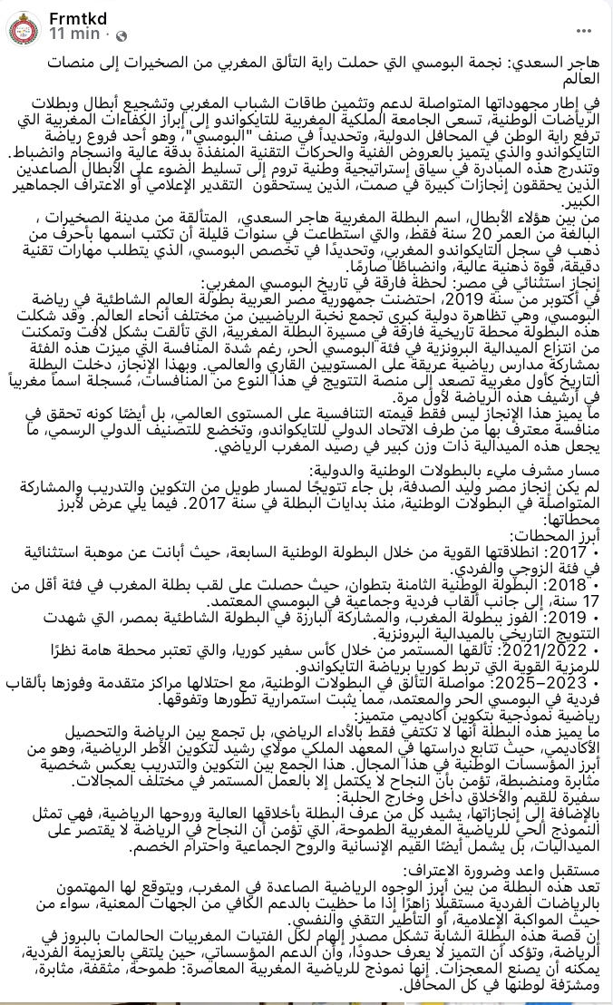 وجاء في رسالة الجامعة: "هاجر السعدي تُمثل نموذجًا للرياضية المغربية المعاصرة، طموحة، مثقفة، مثابرة، ومشرّفة لوطنها في كل المحافل". وأكدت الجامعة أن البطلة استطاعت "في سنوات قليلة أن تكتب اسمها بأحرف من ذهب في سجل التايكواندو المغربي، وتحديدًا في تخصص البومسي، الذي يتطلب مهارات تقنية دقيقة، قوة ذهنية عالية، وانضباطًا صارمًا".