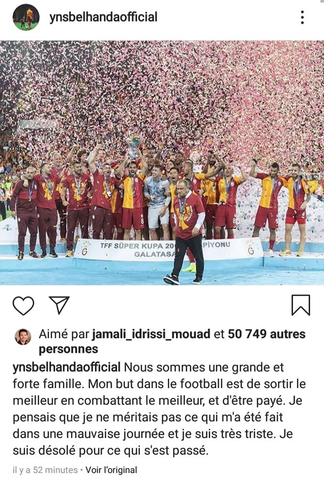 على خلفية الأحداث التي أعقبت تغيير الدولي المغربي "يونس بلهندة" خلال الشوط الثاني من المواجهة التي جمعت فريقه "غالطة سراي" التركي، بفريق ريال مدريد، ضمن الجولة الثالثة من دور المجموعات في دوري أبطال أوروبا، وما صاحبها من غضب كبير للجماهير التركية التي أطلقت صافرات الاستهجان في وجهه، اثر إهداره هدفا محققا خلال الشوط الأول، نشر الدولي المغربي تدوينة عبر حسابه الخاص على "إنستغرام"، طالب من خلالها الصفح والسماح عما صدر عنه من سب وشتم للجمهور التركي.