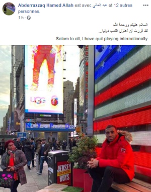 وقال حمد الله المتواجد حاليا في إجازة بالولايات المتحدة الأمريكية:"السلام عليكم ورحمة الله،..لقد قررت أن أعتزل اللعب دوليا."