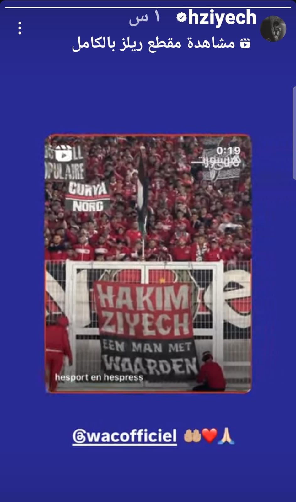 ونشر زياش فيديو لتضامن جماهير الوداد معه على خاصية "الستوري" بحسابه الشخصي على موقع "إنستغرام"، وأرفقه بتعليق يحمل رمز الحب والامتنان لجماهير "الواك".
