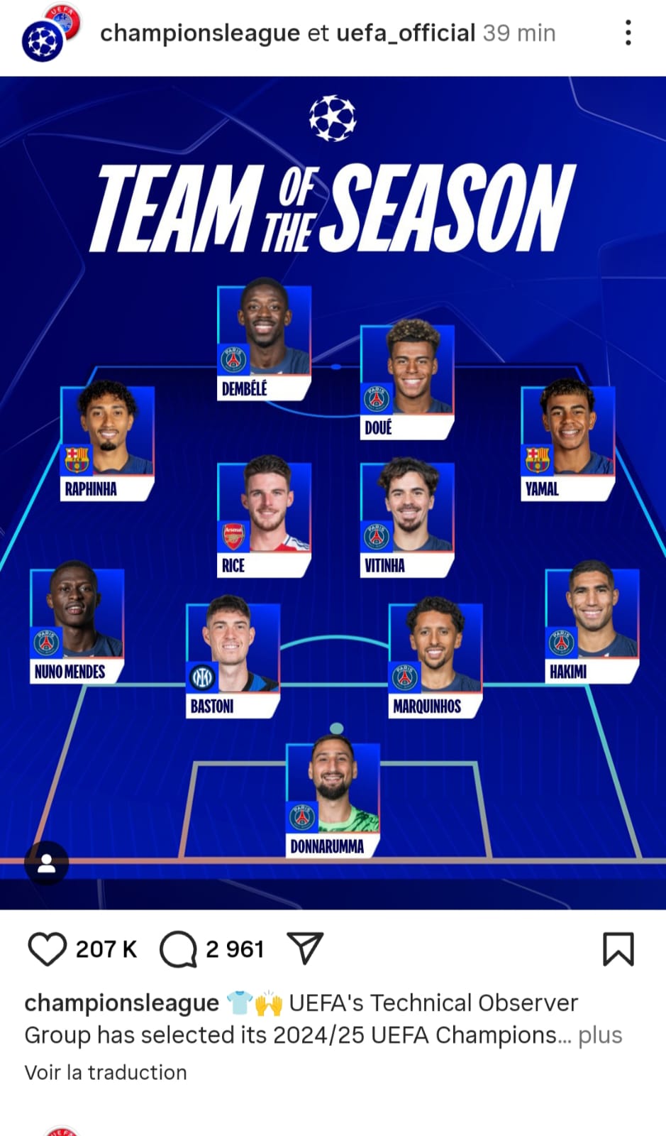 وشهدت التشكيلة، التي ضمت 11 لاعبًا، سيطرة واضحة لبطل النسخة الحالية نادي باريس سان جيرمان الفرنسي، حيث تم اختيار سبعة من لاعبيه، من بينهم الظهير الأيمن المغربي، الذي قدّم موسمًا استثنائيًا مع الفريق الباريسي على الصعيد القاري.