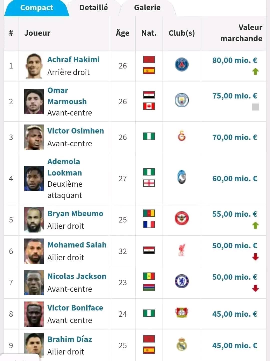 ويتصدر "أشرف حكيمي" حاليًا قائمة أغلى اللاعبين الأفارقة والعرب، متفوقًا على أسماء وازنة مثل النيجيري "فيكتور أوسيمين" الذي تبلغ قيمته 70 مليون يورو، والمصري "محمد صلاح" بقيمة 50 مليون يورو، فيما جاء في المركز الثاني "عمر مرموش" بقيمة 75 مليون يورو، متبوعًا بـ"أديملو لوكمان" (60 مليون يورو)، و"براين مبويمو" (55 مليون يورو). كما تجاوز حكيمي نجومًا شبابًا مثل نيكولا جاكسون (50 مليون يورو) وإبراهيم دياز (45 مليون يورو).