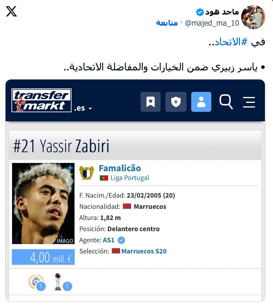 تصاعدت خلال الساعات الماضية ردود الفعل المغربية تجاه أخبار تشير إلى اهتمام نادي الاتحاد السعودي بالتعاقد مع مهاجم نادي فاماليكاو البرتغالي، المغربي "ياسر زبيري"، البالغ من العمر 20 عامًا، خلال فترة الانتقالات الشتوية الجارية "يناير 2026".