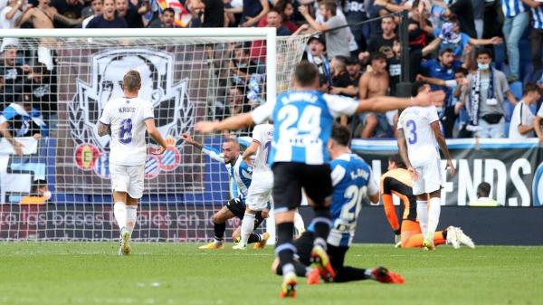 ألحق فريق إسبانيول الهزيمة الأولى بفريق ريال مدريد في الدوري الإسباني لكرة القدم، بعدما تغلب عليه 2 - 1 اليوم الأحد في الجولة الثامنة من المسابقة، والتي شهدت أيضا فوز إلتشي على سلتا فيغو 1 - صفر.