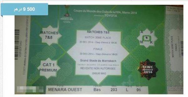 و في ظل عدم توفر تذاكر لحضور النهائي ، استغلت بعض الاطراف الموقف لاعادة بيع تذاكرها عبر طرحها للبيع على شبكة الانترنت بأثمنة بلغت 2000 درهم بالنسبة لتذاكر البوابة الغربية (الكتبية)، بينما بلغت تذاكر الدرجة الممتازة، 9500 درهم رغم أن ثمنها الحقيقي هو 1000 درهم.