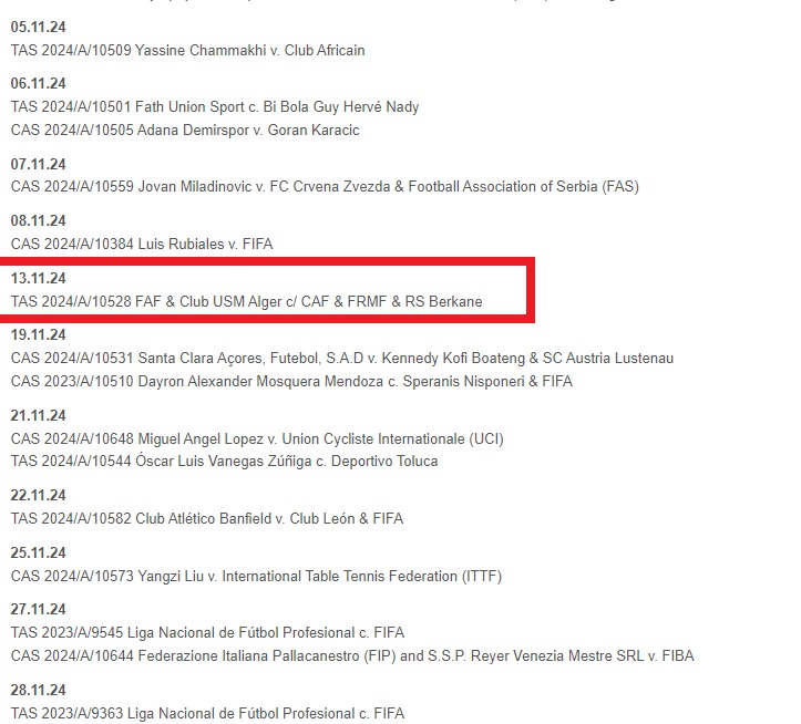 المحكمة لم تقدم تفاصيل إضافية، واكتفت بالإشارة إلى القضية تحت الرقم TAS 2024/A/10528 FAF & Club USM Alger c/ CAF & FRMF & RS Berkane، مدرجة في قائمة الجلسات المقررة لهذا اليوم.