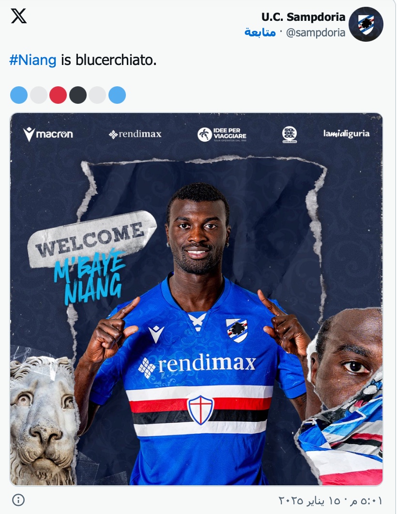 تلقت جماهير الوداد الرياضي بصدمة كبيرة، خبر انضمام المهاجم السنغالي "مباي نيانغ"، إلى صفوف نادي سامبدوريا الإيطالي، بموجب عقد يمتد إلى غاية نهاية الموسم الكروي الحالي.