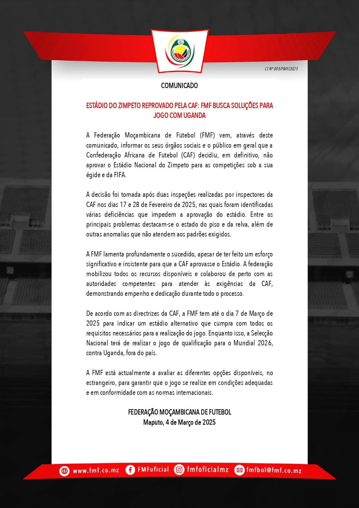 وفي بيان له، أشار اتحاد الموزمبيقي لكرة القدم إلى أن تقرير "كاف" أقرّ بتحسن جزئي في صيانة مرافق الملعب، لكنه أشار إلى أن سطح الملعب (العشب) لا يلبي الحد الأدنى من معايير الفيفا والاتحاد الإفريقي للمباريات الدولية من الفئة الثالثة، بالإضافة إلى اكتشاف "عيوب حرجة" تتطلب تدخلاً عاجلا.