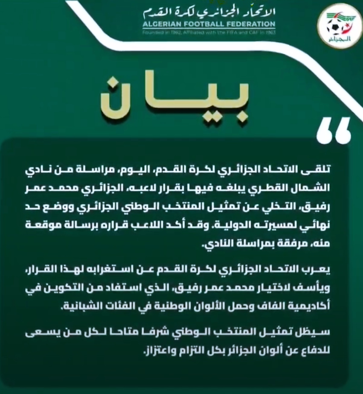 كما أوضح البيان أن رفيق أرفق رسالة مكتوبة بخط اليد تؤكد اختياره عدم اللعب للمنتخب الجزائري.