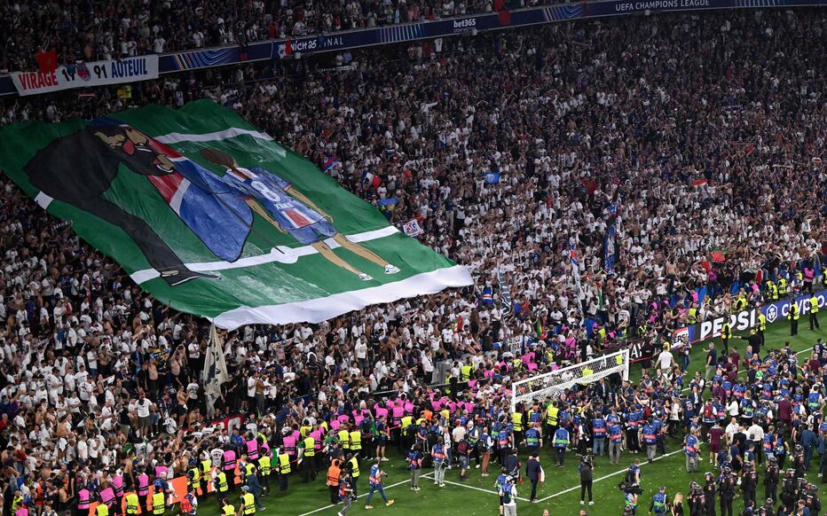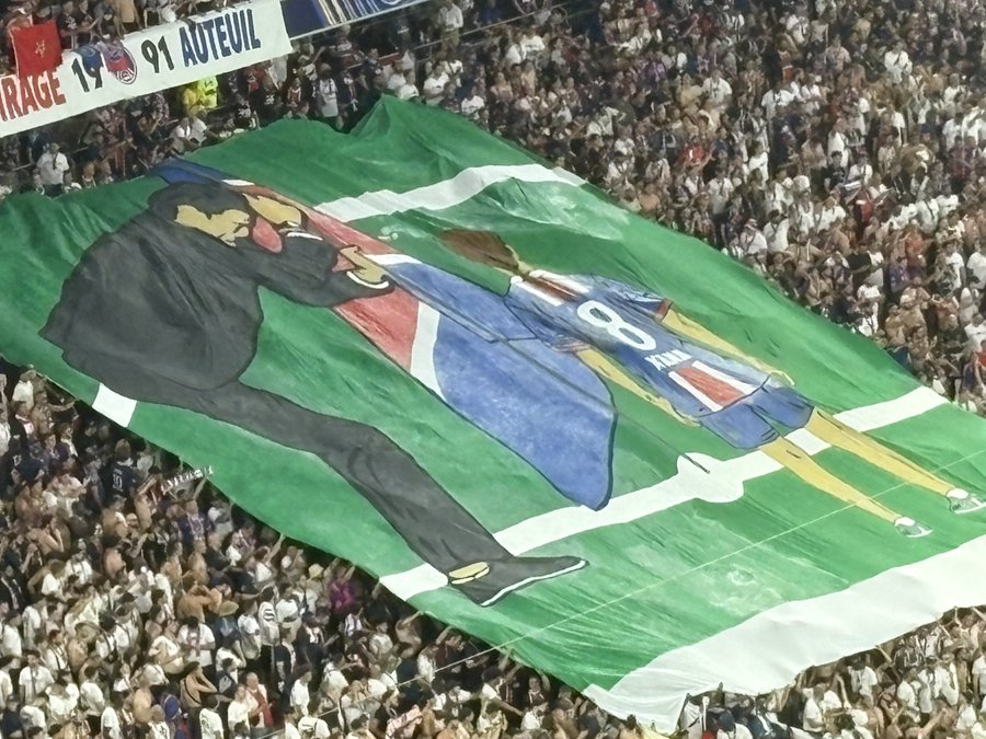 التيفو جسّد صورة لويس إنريكي وهو يرتدي قميص باريس سان جيرمان، إلى جانب ابنته التي ظهرت وهي تزرع علم الفريق على أرض الملعب، في مشهد استُلهم من احتفالهما المشترك بلقب دوري الأبطال مع برشلونة عام 2015.