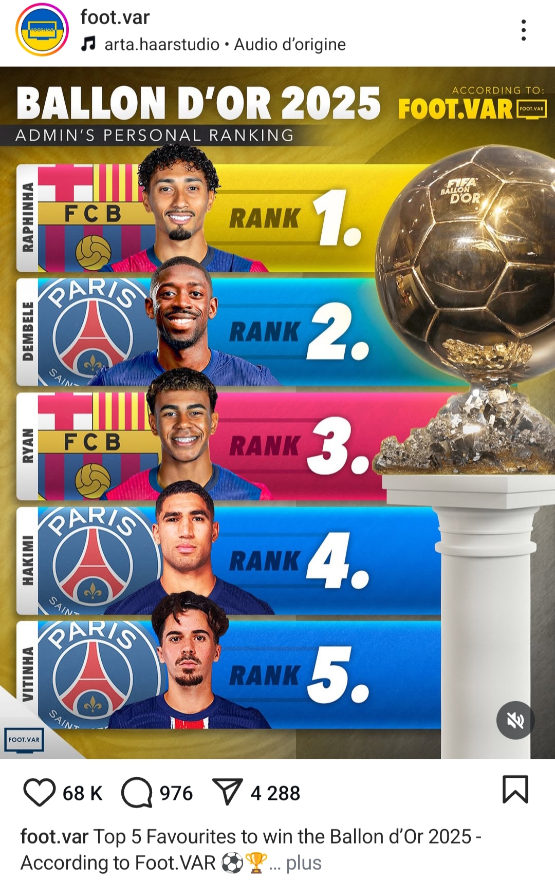 وبحسب المصدر، فإن الأحق بالفوز بالجائزة هو الجناح البرازيلي رافينيا، لاعب برشلونة، الذي قدم موسماً استثنائياً وساهم بشكل كبير في فوز فريقه بالثلاثية المحلية.