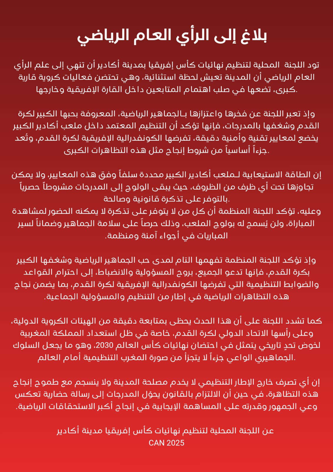 في إطار استضافة مدينة أكادير لمباريات كأس إفريقيا 2025، أصدرت اللجنة المحلية المنظمة بلاغًا تؤكد فيه على أهمية السلوك الجماهيري الحضاري وتنظيم الدخول إلى ملعب أكادير الكبير.
