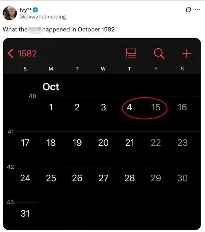 فاجأ اختفاء مفاجئ لعشرة أيام من تقويم أجهزة آيفون مستخدمي وسائل التواصل الاجتماعي، بعدما لاحظ أحدهم أن التواريخ تقفز مباشرة من 4 أكتوبر إلى 15 أكتوبر عام 1582. وسرعان ما انتشرت الصورة التي توثق هذا الأمر بشكل واسع على منصة "إكس"، حيث حصد المنشور أكثر من 49 مليون مشاهدة، وانهالت التعليقات المتسائلة والساخرة عن "مصير الأيام المفقودة".