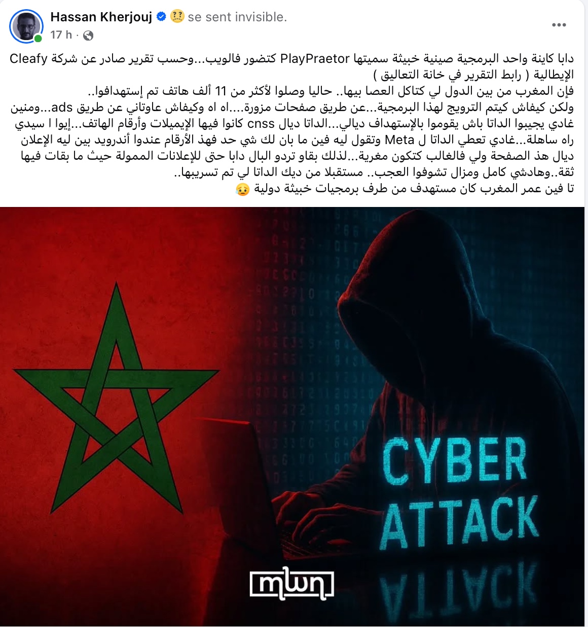 وفي تفاعل له مع الموضوع، نشر الأستاذ "حسن خرجوج"، الخبير في الأمن السيبراني، تدوينة تحذيرية عبر حسابه على الفيسبوكي، أكد من خلالها أن المغرب من بين الدول "اللي كتاكل العصا" بسبب هذه الحملة، حيث قدم بالمناسبة شرحا دقيقا للكيفية التي تتم بها عملية الترويج لهذه البرمجية الخبيثة عبر صفحات مزورة تبدو كصفحات تحميل أو عروض مغرية، بالإضافة إلى إعلانات مدفوعة تستهدف المستخدمين بدقة عالية.