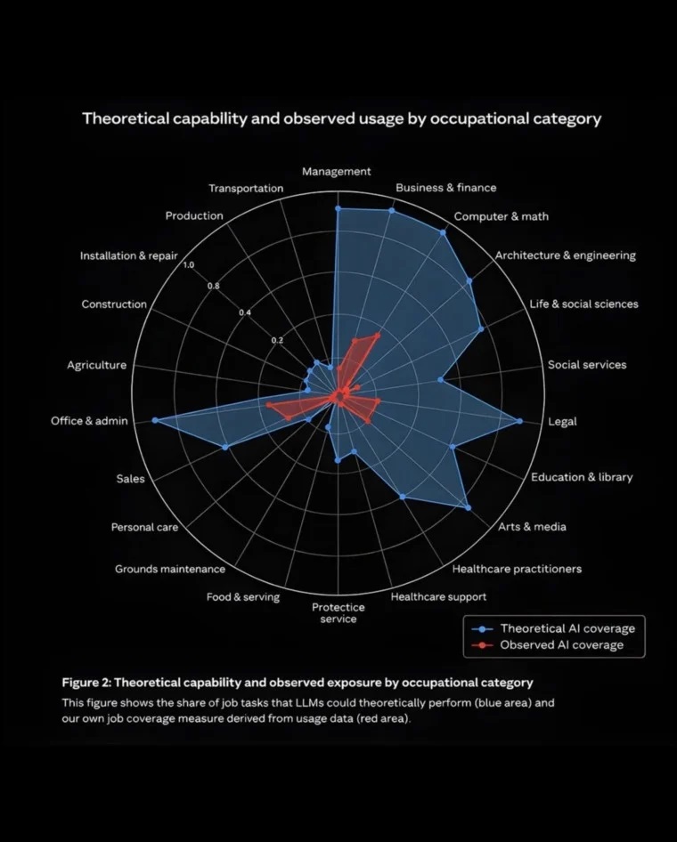 وفي هذا السياق، اعتمدت الشركة على رسم بياني بات محل اهتمام واسع في الأوساط المهنية، يقوم على مقارنة مؤشرين رئيسيين: اللون الأزرق الذي يرمز إلى المهام التي يستطيع الذكاء الاصطناعي تنفيذها من الناحية التقنية، واللون الأحمر الذي يعكس حجم المهام التي بدأ الموظفون فعليا في إسنادها إلى أدوات الذكاء الاصطناعي. ويبرز هذا التباين، بحسب التقرير، المسافة الفاصلة بين ما هو ممكن تقنيا وما أصبح واقعا يوميا داخل المؤسسات.
