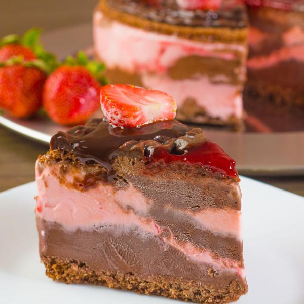بملعقة الآيس كريم ضعي طبقة من آيس كريم الفراولة اللين ثم طبقة كيك ثم طبقة آيس كريم الشوكولاتة بالتبادل. ونصف كمية صوص الفراولة.