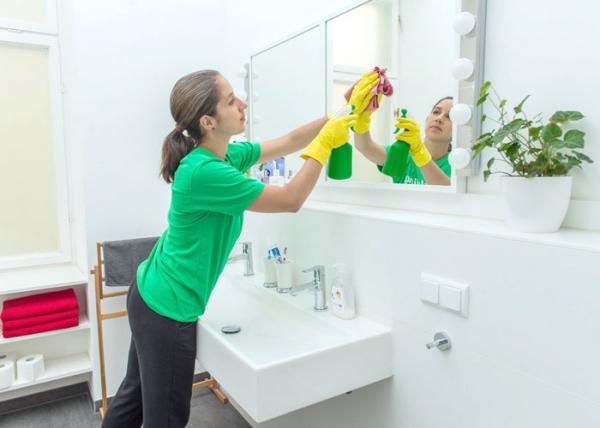 أضف على المرآة منظف أو ملمع يرش من الزجاجة الملمع وفوطة ناشفة امسح بها المراة من تحت لفوق بحركة دوائر لكي تصبح لامعة ونظيفة يوميا.
