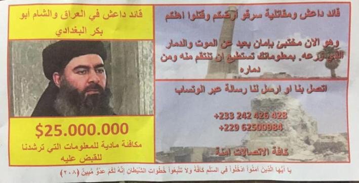وفي مقابل صورة البغدادي، كتب في الجهة اليمنى من المنشور "قائد داعش ومقاتلوه سرقوا أرضكم وقتلوا أهلكم، وهو الآن مختبئ بأمان بعيدا عن الموت والدمار الذي زرعه، بمعلوماتك تستطيع أن تنتقم منه ومن دماره، اتصل بنا أو ارسل لنا رسالة عبر الواتساب"، ووضعت أرقام هواتف وتحتها عبارة "جميع الاتصالات آمنة".